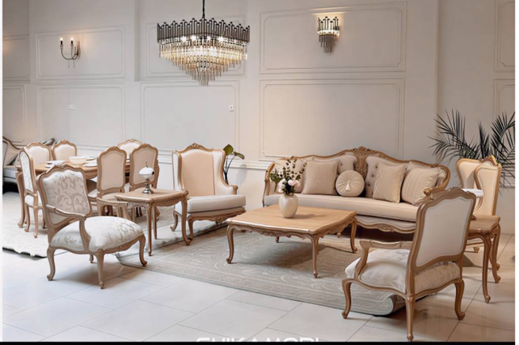 طراحی دکوراتیو و کاربردی: همانطور که در تصویر پیداست، ترکیب کاناپه با تکیهگاه لمسهدوزی شده و صندلیهای تکنفره ظریف، فضایی اشرافی و در عین حال گرم برای مهمانیهای شما فراهم میکند.